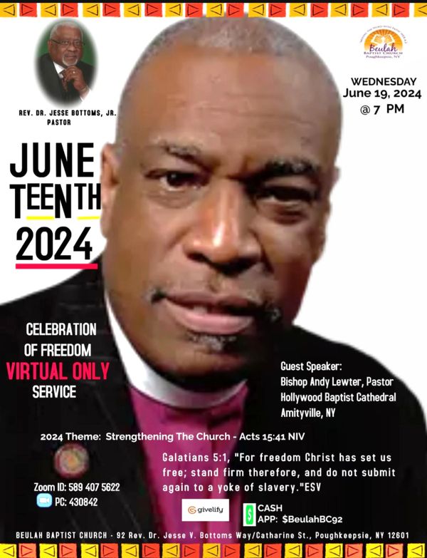 Beulah Baptist Church located in Poughkeepsie NY is having a Virtual Juneteenth Virtual celebration on Wednesday, June 17, 2024 at 7 PM.