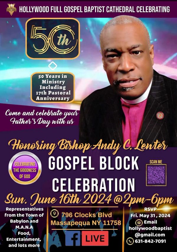 On Sunday, June 16, 2024 from 2PM - 6 PM, there will be a Gospel Block Party Celebration at the Bishop's house 796 Clocks Blvd, Massapequa, NY 11758.