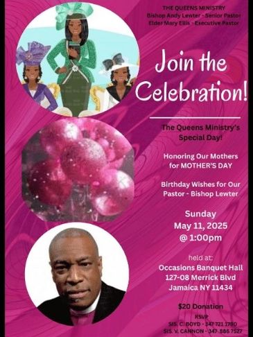 1 PM - 4 PM for a luncheon celebration of Mother's Day and our Pastor Bishop Andy C. Lewter's Birthday. The event will be held at Occasions Catering Hall located at 127-08 Merrick Blvd. Springfield Gardens, NY 11434