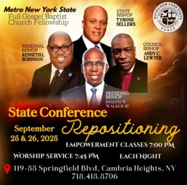 The 2025 Metro New York State Full Gospel Baptist Church Fellowship will be held on September 25 and 26, 2025 at